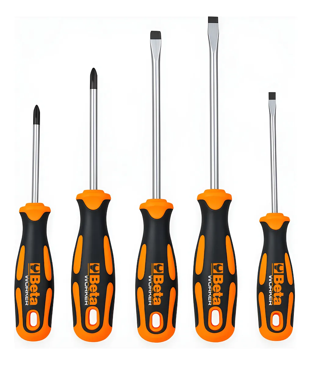 O jogo BW 1203E/S5 inclui chaves fenda com medidas 0,5x3x100 mm, 1x5,5x150 mm e 1,2x6,5x150 mm; além das chaves Phillips PH1x75 mm e PH2x100 mm. As peças possuem cabos emborrachados para resistência e melhor controle.